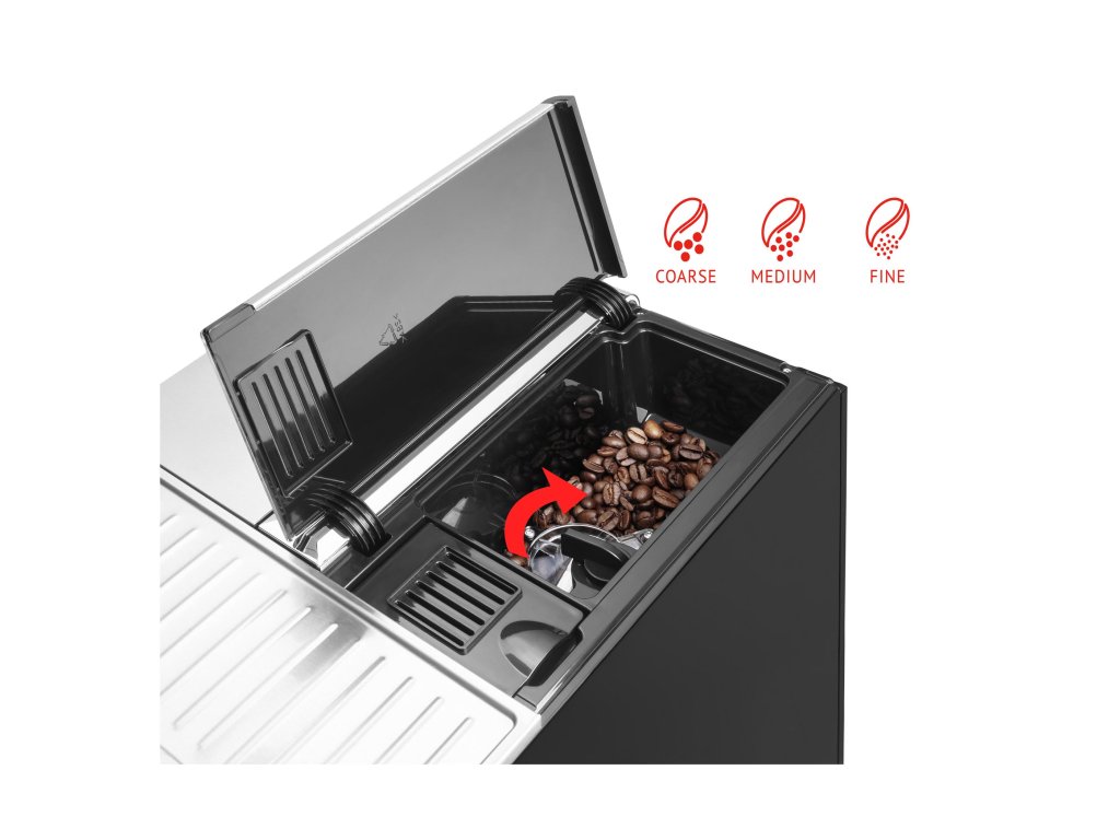 Lahodná, perfektní a tak jednoduše připravená. Catler to s kávou umí a naše nové automatické espresso Catler EA 850 vás o tom přesvědčí každý den. Na 7“ ostrém barevném displeji si vyberte, na jaký nápoj máte zrovna chuť a připravte si ho díky možnosti vlastního nastavení tak, jak ho máte rádi. Vybrat se také můžete z 18 kávových receptů!Espresso, Americano, Macchiato nebo Cortado bude připraveno vždy precizně! Automatické espresso má tlak 19 bar, je vybaveno ocelovým mlýnkem s možností nastavení hrubosti mletí, zásobníkem na kávu s kapacitou 250 g a signalizací docházející kávy.