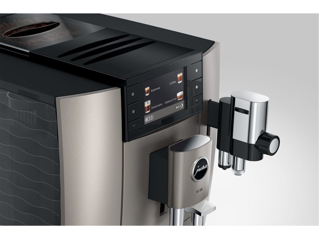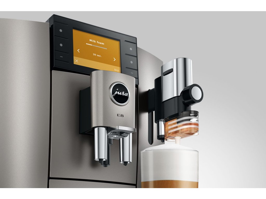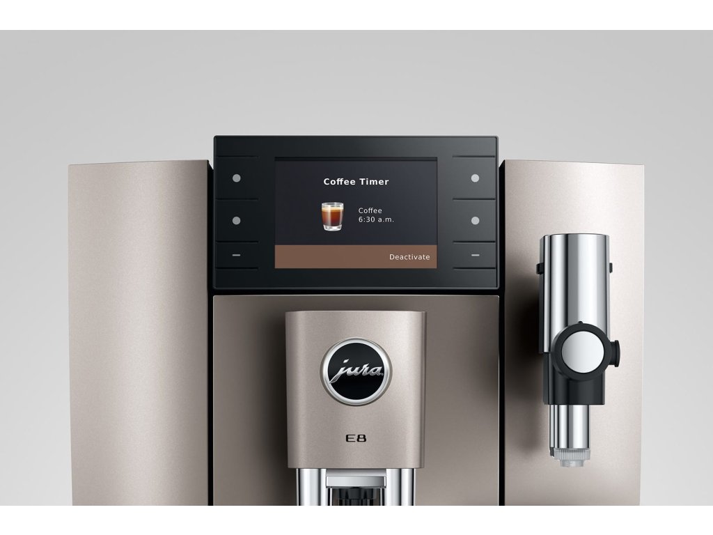 Kávovar E8 nabízí více pohodlí, než kdykoli předtím. Díky funkcím Coffee Timer a J.O.E.® je vaše ranní káva připravena ihned jak vstanete, a je perfektní cestou pro začátek nového dne. Funkce Quality Assistant zajišťuje úspornější údržbu kávovaru E8 a zaručuje maximální hygienu pro maximální požitek. Milovníci kávy se mohou snadno orientovat v různých světech požitku, které jsou pro přehlednost barevně odlišeny, na 3,5palcovém barevném displeji s bočními tlačítky.