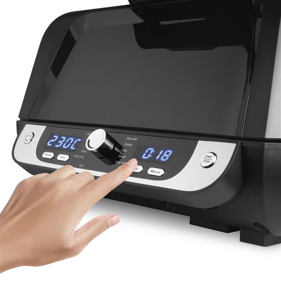 Horkovzdušná fritéza s grilem se velmi snadno používá. Na přední straně se nachází velký a přehledný LED displej s digitálním ovládáním. Abyste měli o přípravě dokonalý přehled je vybavena velkým průhledem a vnitřním osvětlením.