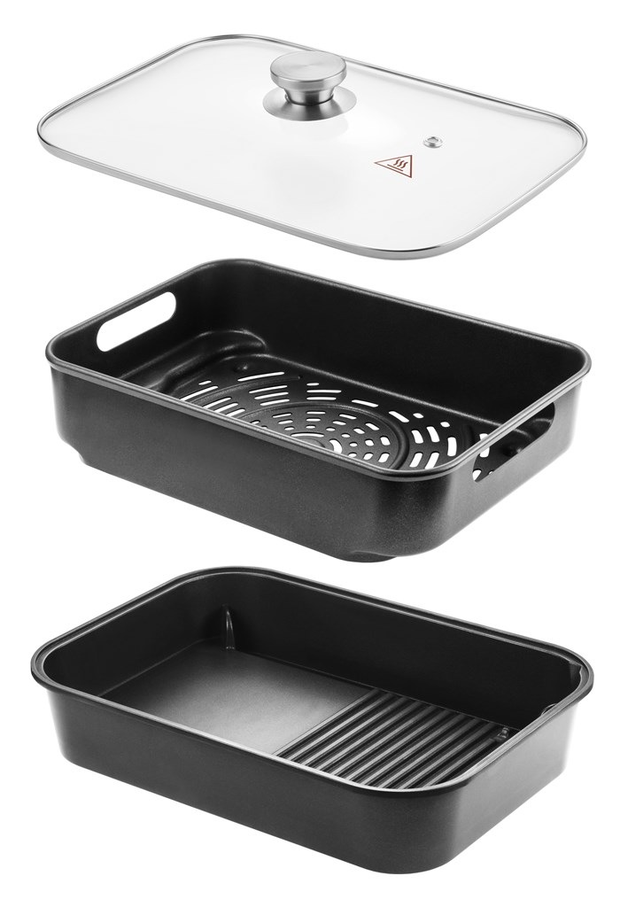 Součástí balení je fritovací košík, hrnec na vaření / grilovací mřížka, skleněné víko (vhodné i do trouby) a kartáček na čištění.