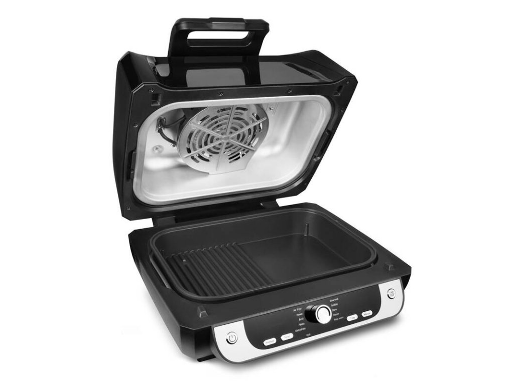 - Fritéza vybavena horním konvekčním topným tělesem a spodní topnou deskou s nepřilnavým povrchem