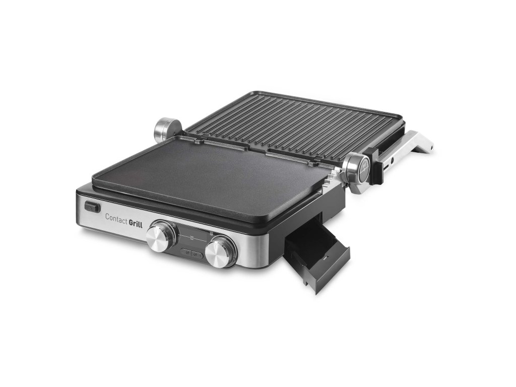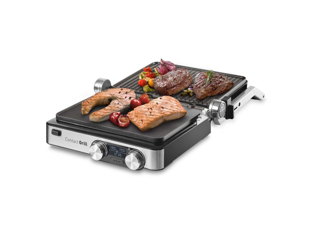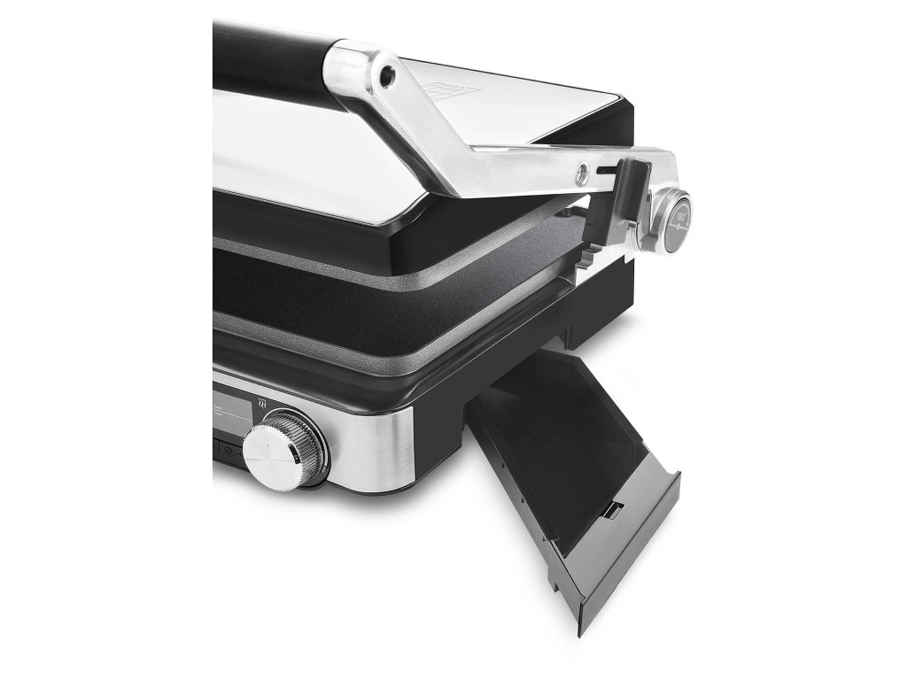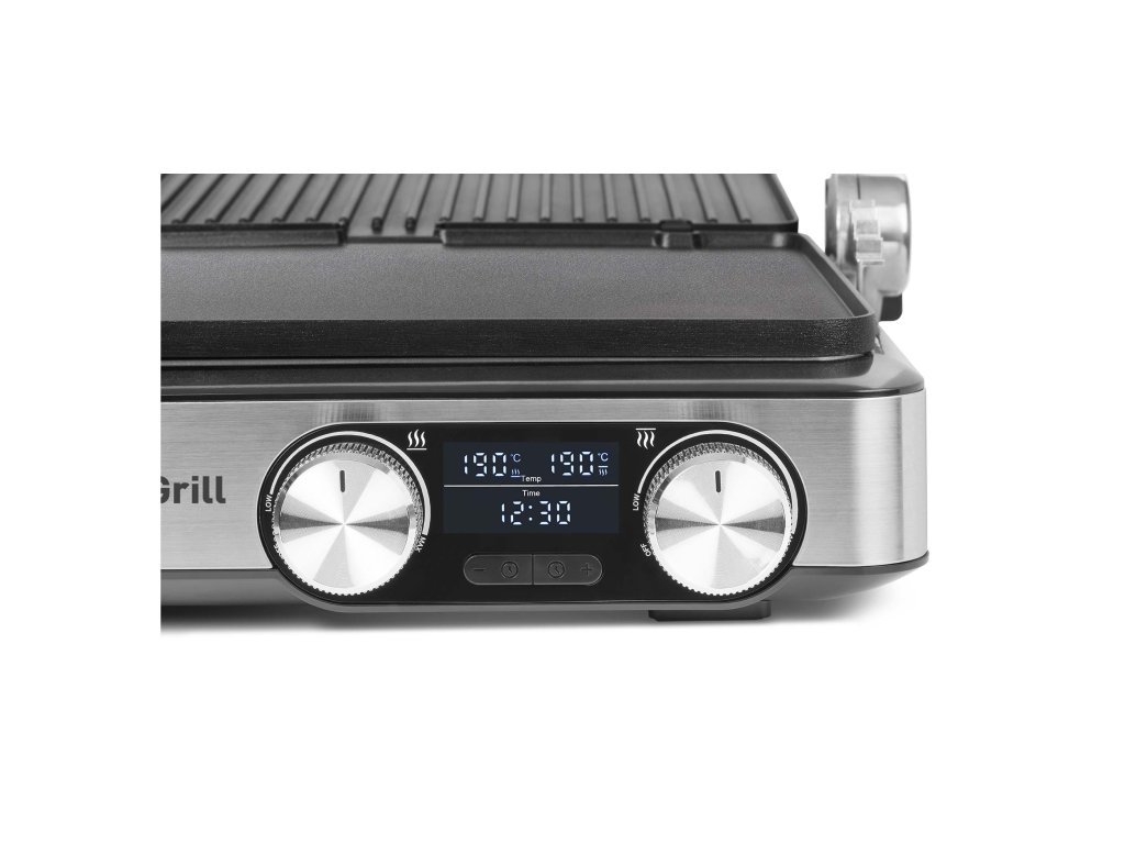 Opravdové grilování po celý rok s grilem Philco PHGR 7000 F. Budete zbožňovat krásné grilované linky na mase a zamilujete se do jednoduchosti celé přípravy i následném úklidu. Díky topnému tělesu přímo na grilovací desce využijete maximum z vytvořeného tepla a budete skutečně grilovat a to i pořádné fláky masa. Tento gril je možné používat buď v poloze kontaktního grilu nebo barbecue při rozložení, kdy získáte větší grilovací plochu. Navíc má každá deska nezávislé ovládání teploty a proto můžete na jedné grilovat a na druhé jen jídlo přihřívat.Na grilu oceníte i jeho vizuální stránku. Gril je vyroben v nerezovém designu a má dominantní ovládací panel s LED digitálním displejem. Mezi další vychytávky grilu patří pevné nastavení výšky horní grilovací desky, díky čemuž nerozmačkáte měkké potraviny, nebo výsuvný odkapávací tácek, který se vysouvá velmi prakticky na boku spotřebiče.