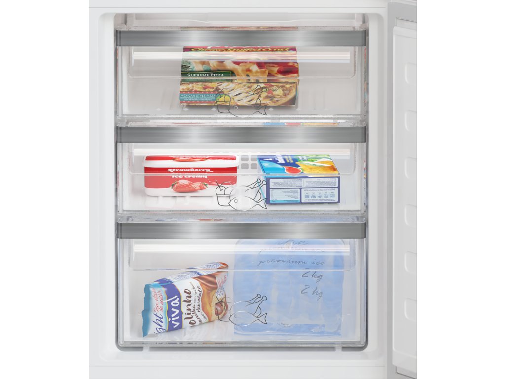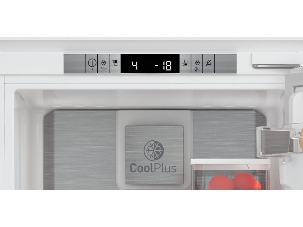 Vestavná kombinovaná chladnička NO FROST; DUO-COOLING; en. třída E; celkový hrubý objem 306 l; elektronická regulace teploty s LED displejem; možnost změny směru otevírání dveří; kluzné panty pro vestavbu; nízkoteplotní zóna SuperFresh; zásuvka na ovoce a zeleninu VitaminZone se třemi typy světla pro dosažení delší čerstvosti potravin; antibakteriální těsnění; akustická signalizace otevřených dveří; režim Dovolená a Eco; spotřeba el. energie: 223 kWh/rok; akumulační doba (výdrž bez proudu) 13 h; hlučnost pouze 37 dB; rozměry (V x Š x H): 193,5 x 54 x 54,5 cm; hmotnost 55 kg.