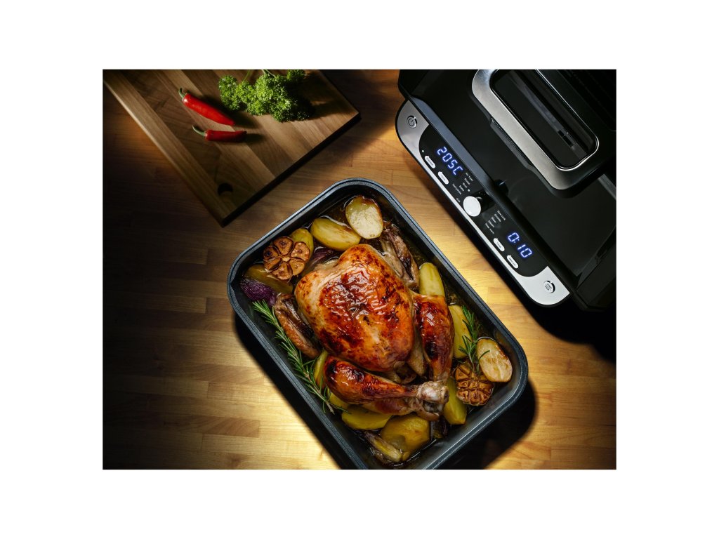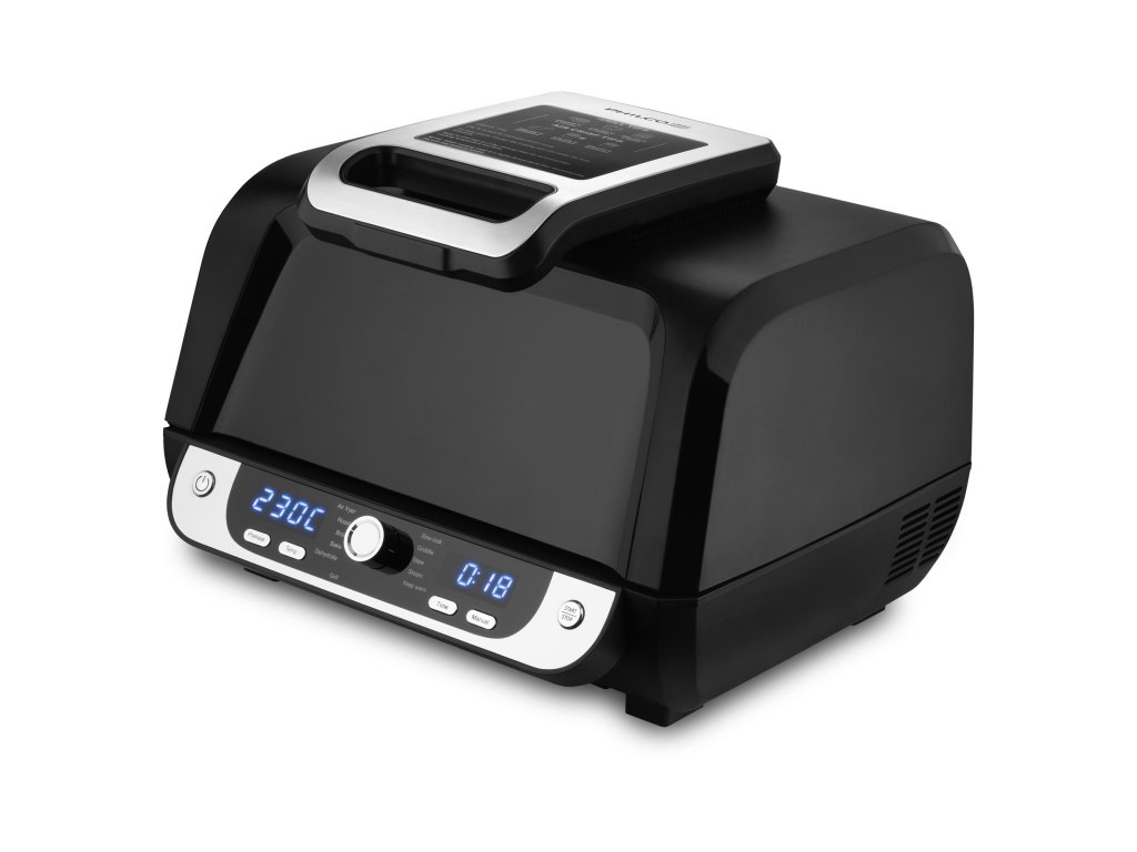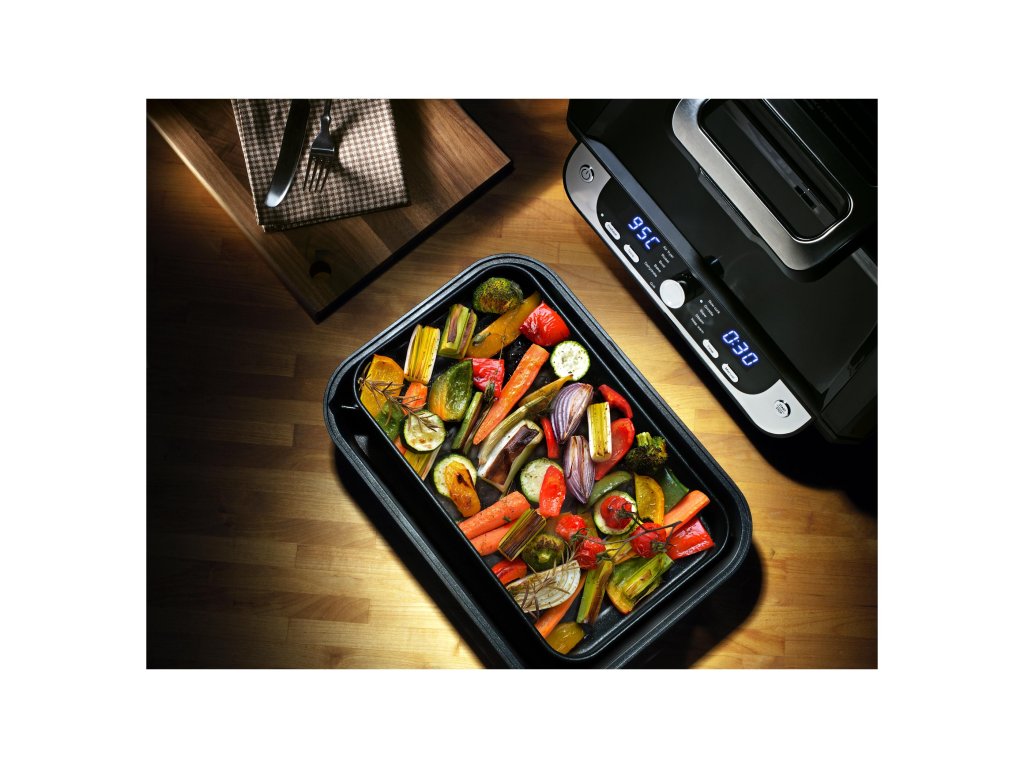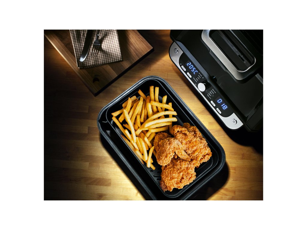 Je vybavena horním konvekčním topným tělesem a spodní topnou deskou s nepřilnavým povrchem, díky vnitřnímu osvětlení a velkému průhledu můžete sledovat krok po kroku průběh přípravy. Po dokončení nastaveného programu či zvolené funkce se fritéza automaticky vypne. Po vychladnutí všechny vyjímatelné části snadno umyjete. Doba přípravy zvoleného pokrmu je kratší s výrazně menší spotřebou energie než při rozehřátí trouby.