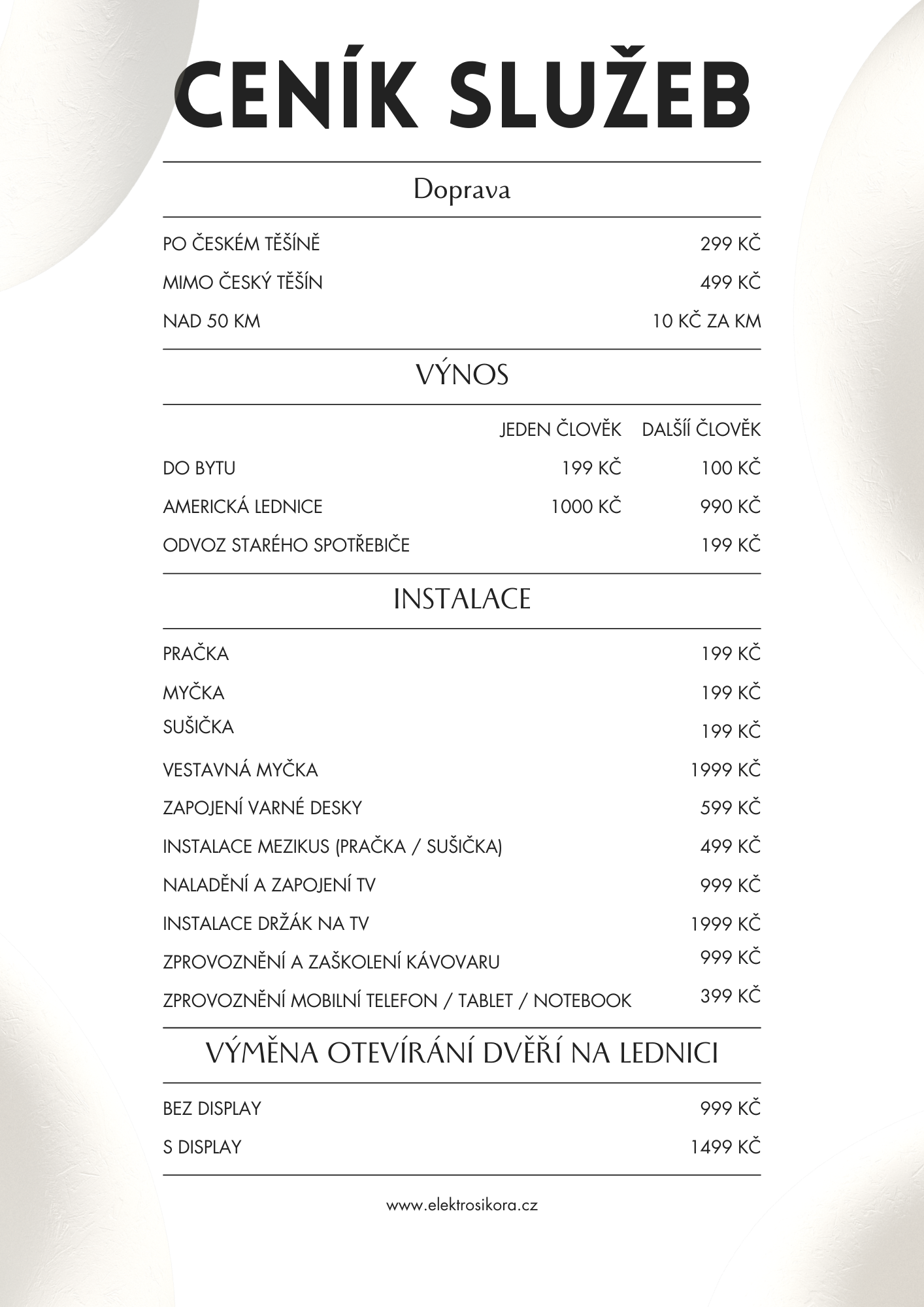 - Doprava a instalace – zajistíme dovoz vybraných spotřebičů k vám domů a jejich odbornou instalaci. Ceník služeb zde