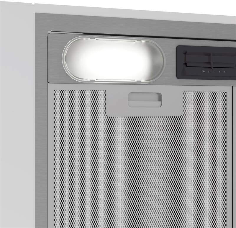 Účinná a příjemná LED světla osvětlí celou varnou plochu. Pokud budete chtít využít recirkulaci, stačí dokoupit uhlíkové filtry. Veškerou mastnotu zachytí kovový tukový filtr, který snadno vyjmete a necháte umýt v myčce. Součástí balení je redukce 120/150.