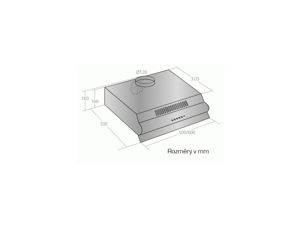 Podskříňková digestoř, šíře 60 cm,nerez, max. výkon 160 m³/h (15 Pa), hlučnost Lw 50 – 61 dB(A), 3 rychlosti, mechanické tlačítkové ovládání, kovové sendvičové tukové filtry, které lze mýt v myčce, možnost práce v odtahovém i recirkulačním režimu, výstupní průměr 120 mm, osvětlení 1 × 4 W LED žárovka E14, Výbava: zdarma zpětná klapka