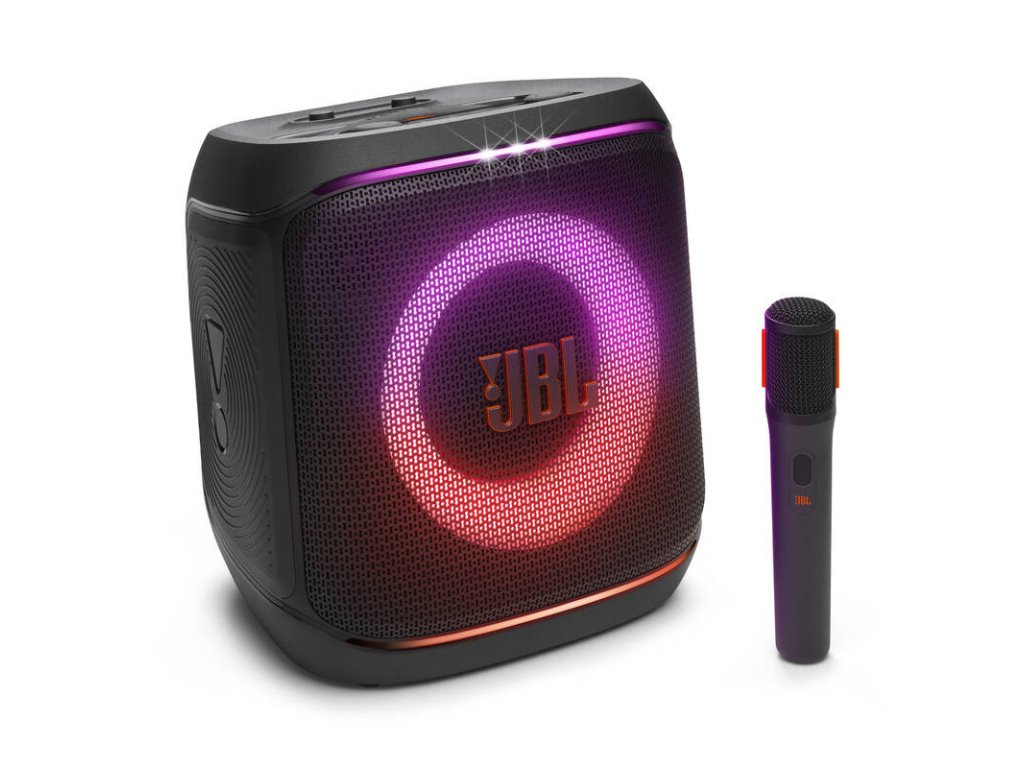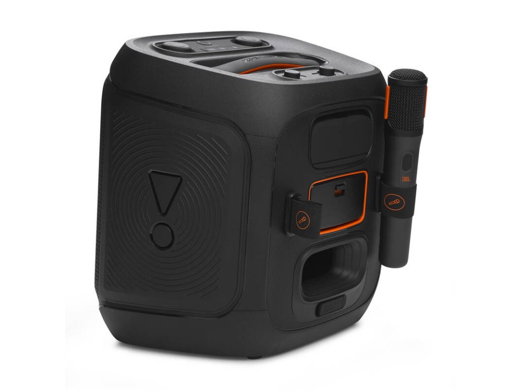 party reproduktor • výkon 100 W • napájení přes výměnný akumulátor • funkce KARAOKE – mikrofon v balení • odolnost IPX4 proti stříkající vodě • světelné efekty • AI Sound Boost • Auracast • aplikace JBL PartyBox • vyměnitelná baterie