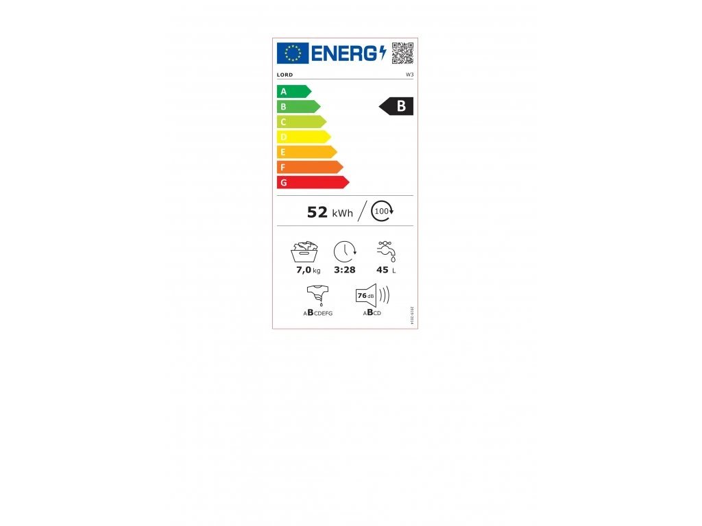 Samostatně stojící předem plněná pračka LORD W3 v energetické třídě B. Díky speciálnímu čidlu sama pozná hmotnost vloženého prádla a přizpůsobí mu celé praní – spotřebu elektrické energie a také vody. Zvládne až 7 kilogramů prádla najednou.