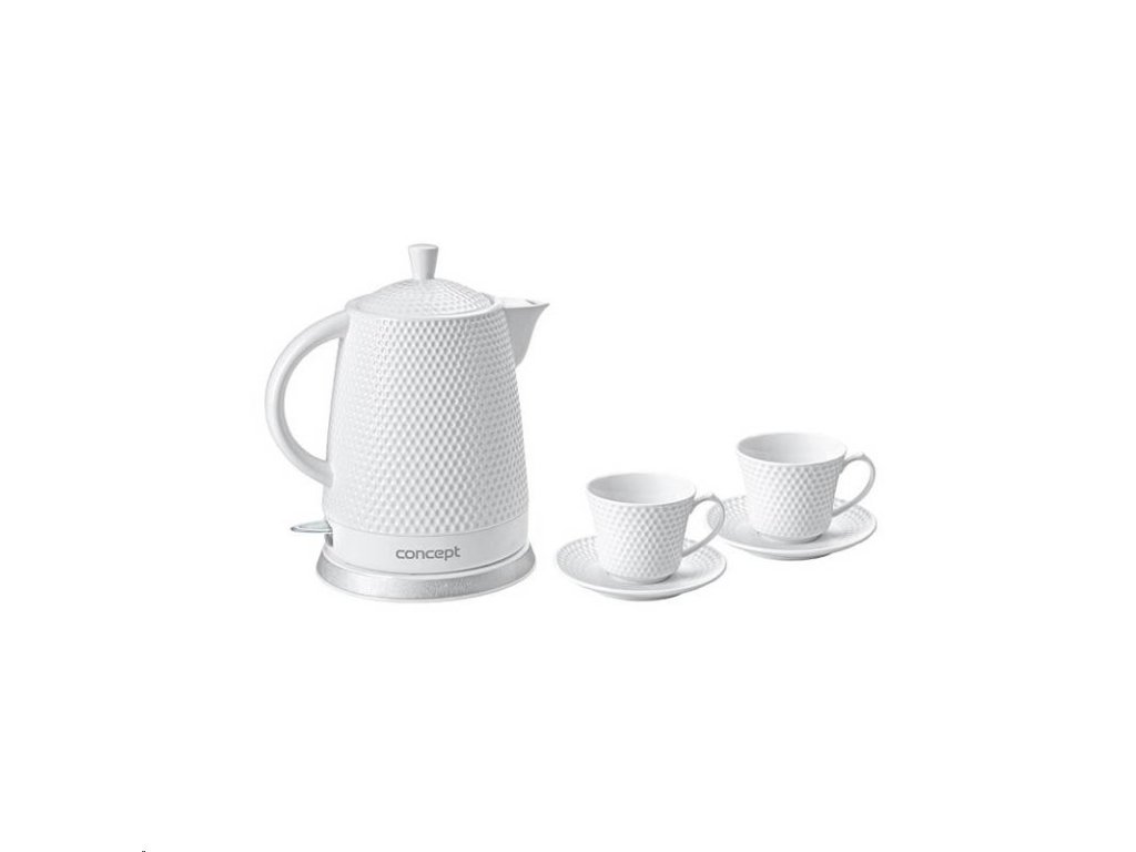 Keramická rychlovarná konvice RK0040 Concept o objemu 1,5 l se dvěma šálky a podšálky.