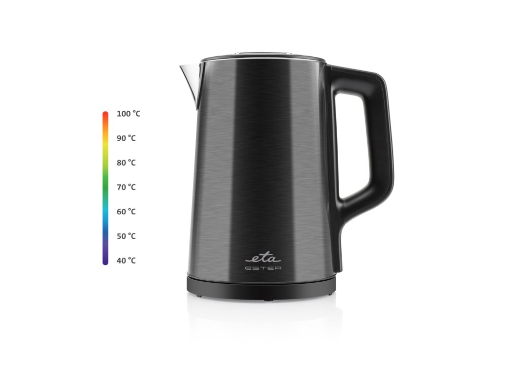Rychlovarná konvice ETA Ester ve dvouplášťovém provedení bude nejen funkčním, ale také designovým doplňkem vaší kuchyně. Na dobře viditelném LED displeji můžete sledovat teplotu vody i během průběhu vaření a pomocí dotykových tlačítek si ji nastavíte od 40 do 100 °C.
