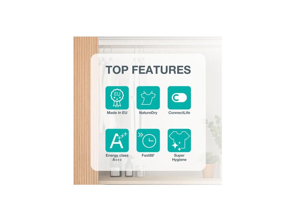 Prémiová sušička evropské kvality s kapacitou 8 kg, špičkovou energetickou třídou A+++, programem NatureDry pro šetrné sušení, chytrým ovládáním ConnectLife a řadou inovativních technologií pro úsporný a komfortní provoz.