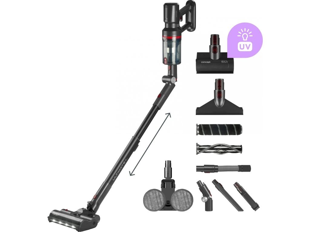 Tyčový vysavač 4 v 1 Ultimate Pro+ 29,6 V Concept VP6260 je ideálním řešením pro každého, kdo hledá flexibilitu, vysoký výkon a všestrannost. Díky širokému příslušenství si ho snadno přizpůsobíte aktuálním potřebám - ať už potřebujete tyčový vysavač pro každodenní úklid, ruční vysavač na drobky, mop pro dokonalé vytírání, nebo UVC sterilizátor na zajištění hygienické čistoty. Tento model si poradí se všemi typy podlah, schody, úzkými prostory, oblastmi bez zásuvek i interiérem auta. Je to multifunkční a výkonný pomocník, který se dokonale přizpůsobí vašemu životnímu stylu.