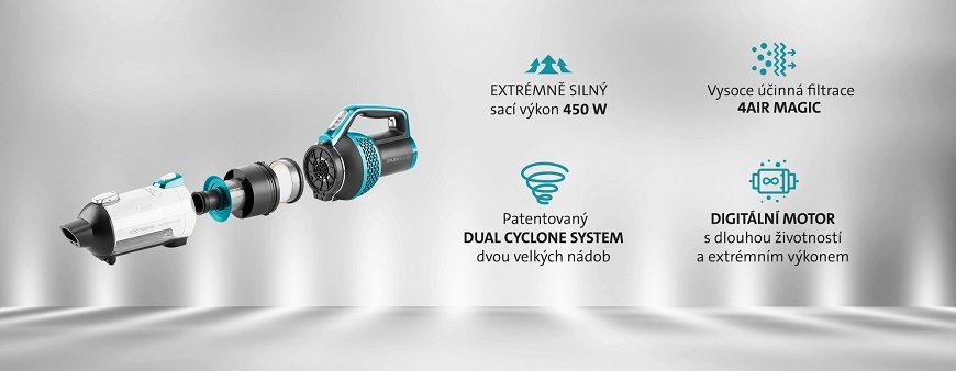 - Patentovaný systém DUAL CYCLONE SYSTEM pro stálý silný sací výkon