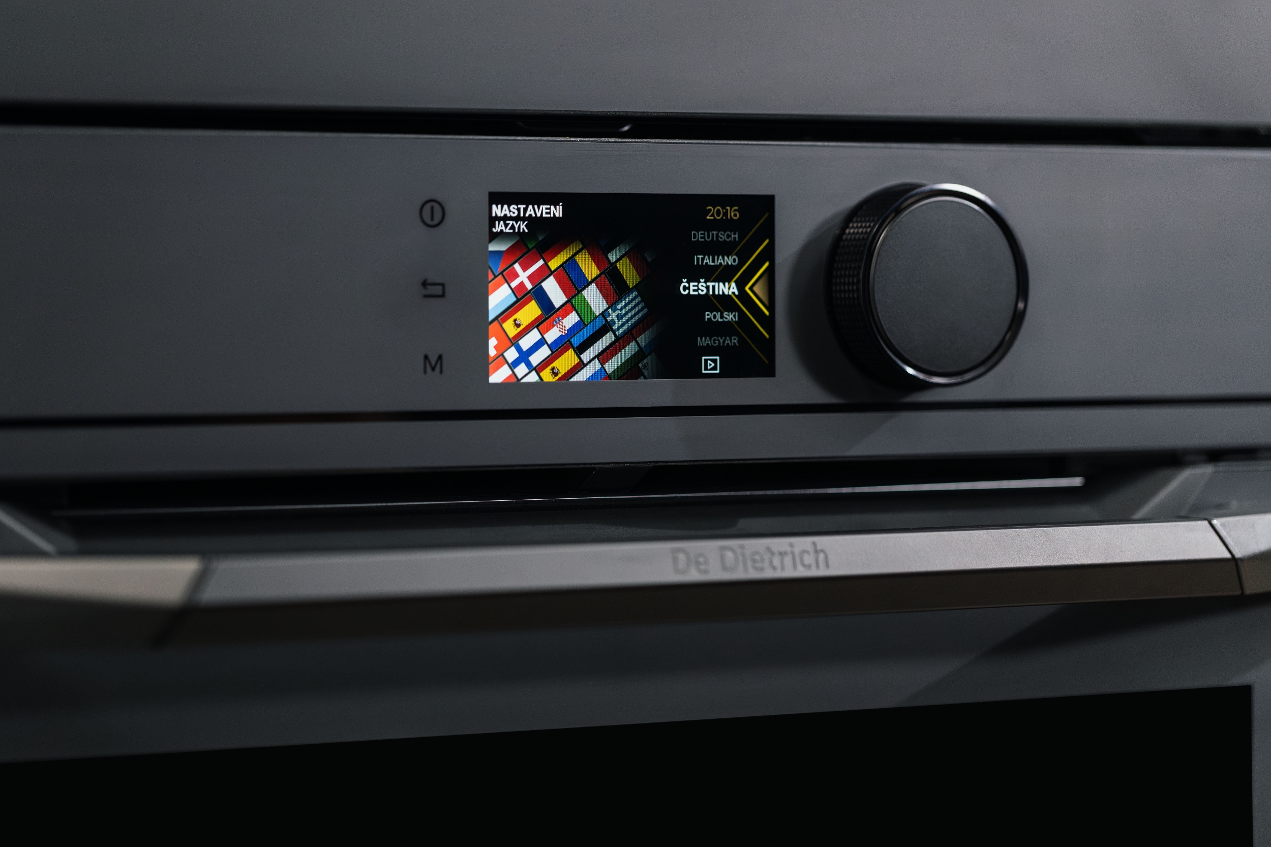 Na dobře viditelném TFT barevném displeji o rozměru 4,3" zvolíte požadovanou přípravu. Nemusíte se trápit s ovládáním v cizím jazyce, v nastavení trouby De Dietrich si snadno nastavíte češtinu.