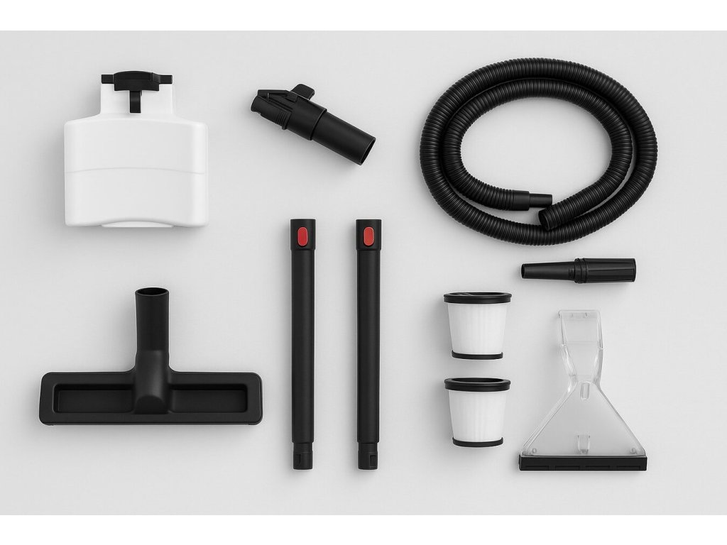 Součástí balení je bohaté příslušenství – dvě 44 cm trubice, flexibilní hadice o délce 1,5 m, kartáče na koberce i čalounění, štěrbinová tryska a nástavec na odsávání vody. Maximální průtok vzduchu přesahuje 28 litrů za sekundu a výkon postřiku dosahuje až 800 ml/min, což umožňuje rychlé a efektivní zvlhčení povrchu před samotným čištěním.
